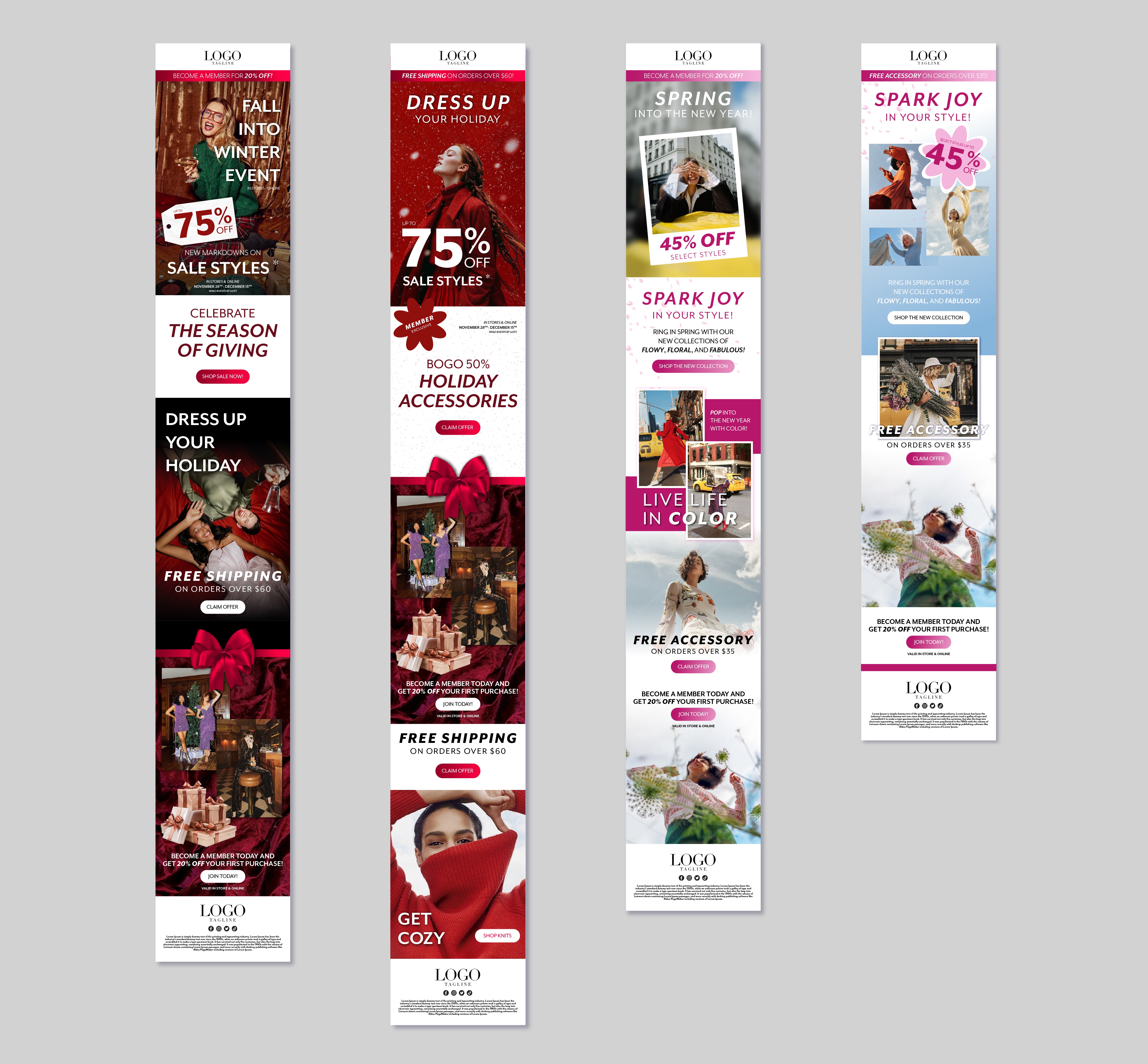 I wanted to branch out of my usual illustration and web work to explore a bit or editorial/fashion design. I've always loved the look of editorial design and am attracted to the boldness that these types of images create, especially when they are used in branding and store imagery. I focused primarily on a Winter season but designed a few spring items as well, given that the two seasons typically have very different color and light usage.